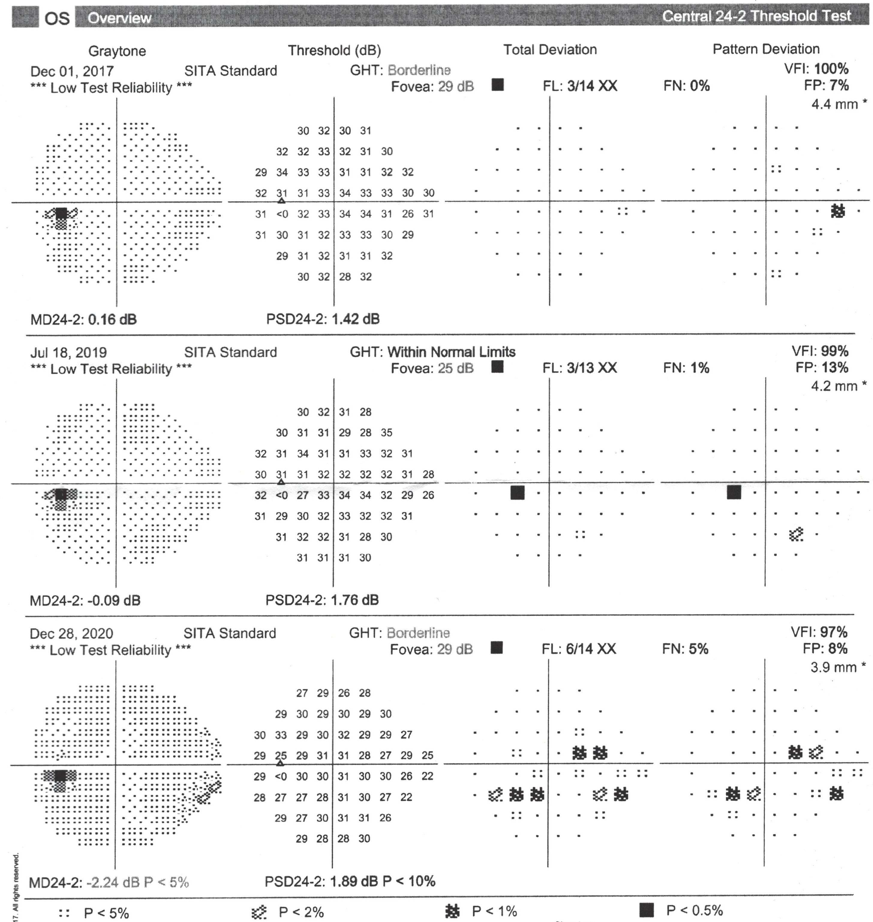 左右眼演示2017年正常,2019年轻微发展,最近视野损害。