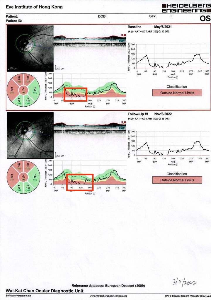 請問上面OD 分別是 2021年5月 及 2022年11月,見到黑色線有些微下降及 OD 及 OS 也是 outside normal limits 是甚麼意思?