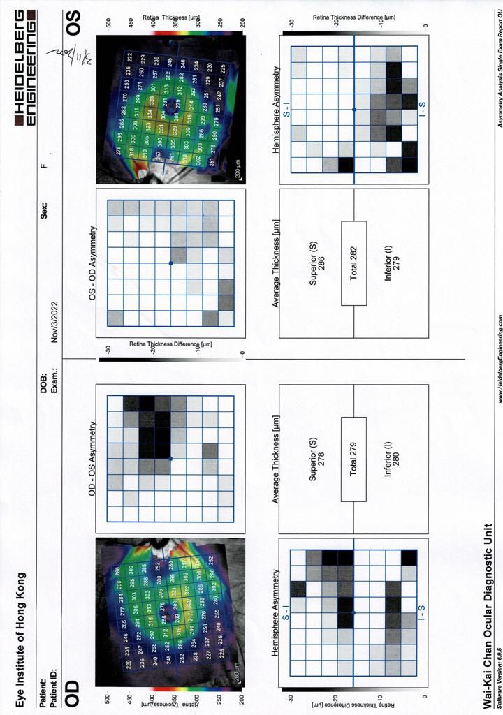 初步看起來,你的oct最厚的地方還算正常,沒有明顯損傷的跡象,紅框處應該是機器的誤差導致下陷,不是真的變薄,而視野左眼上方有一點視野缺損,看起來和oct也對不上,所以感覺是注意力不集中的誤差,雖然去年眼壓25,但看起來並未對視神經造成損傷,所以建議再找另一間醫院,再做青光眼確認,並把角膜厚度這家因素考慮進去,因為角膜厚度厚的話,實際眼壓會更低,個人認為可以不點藥觀察,可以請醫院再評估看看