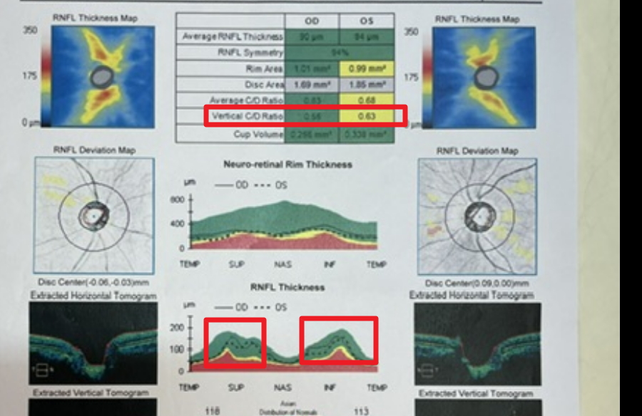 另外還有一個可能是,OCT上的杯盤比常常會偏大,通常會以醫生直接看眼底的杯盤為主,可能醫生直接看覺得杯盤比還算正常,所以就認為沒有青光眼。