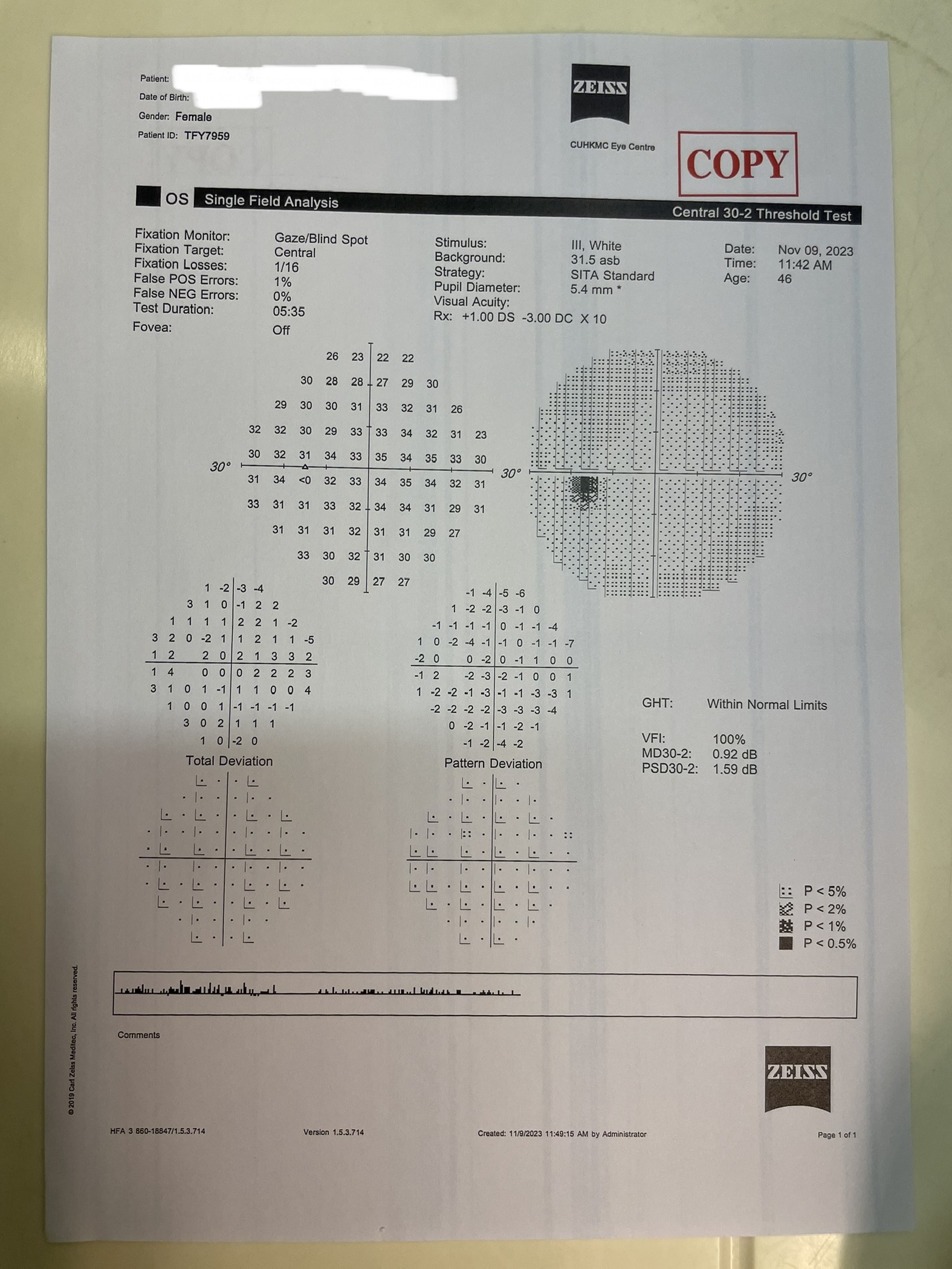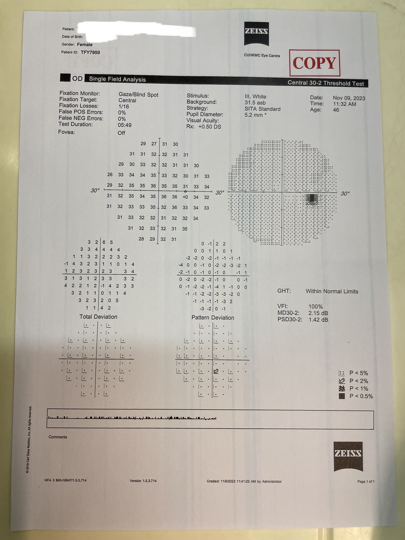 及後我再找另一位眼科醫師聽取意見,他安排我進行視野檢查。他連同第一位醫師做的OCT報告解說,結論我沒有青光,眼藥都不用點,定期追蹤便可。