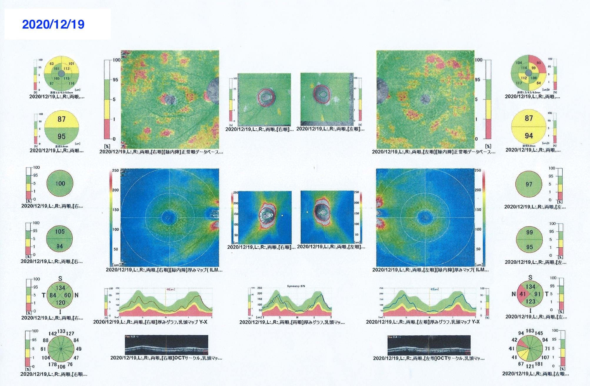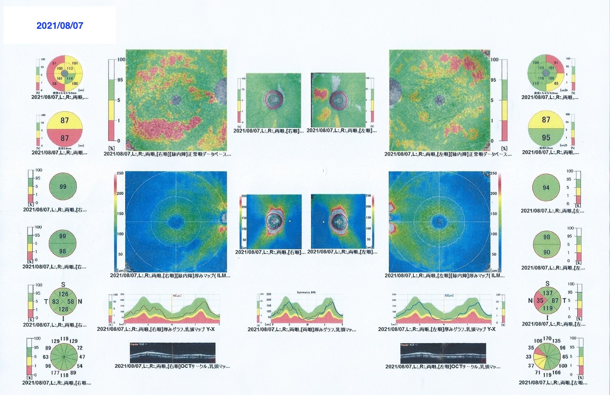 眼壓也是左21右22,只是右眼的OCT圖片,眼球下方有一塊紅色的區域出現了,數值記得是87。左眼是95,左眼一切正常。