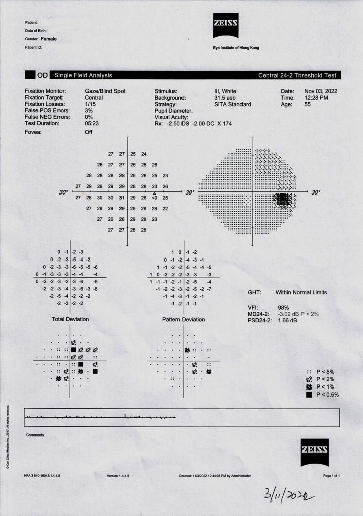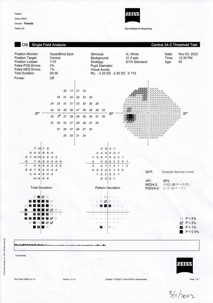 黑色線及outside normal limits,表示不正常,但這是因為機器沒掃描好到誤差。 以你的oct來看,不太會會產生視野缺損,除非你oct有變薄,視野產生缺損,才能確診