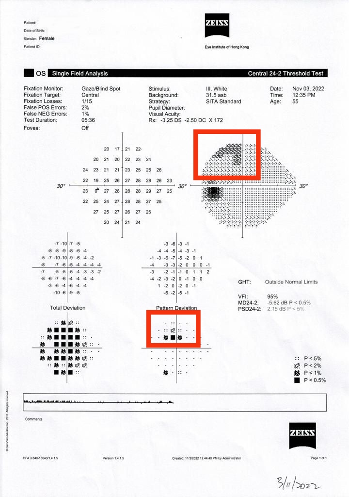 請問上面OD 分別是 2021年5月 及 2022年11月,見到黑色線有些微下降及 OD 及 OS 也是 outside normal limits 是甚麼意思?