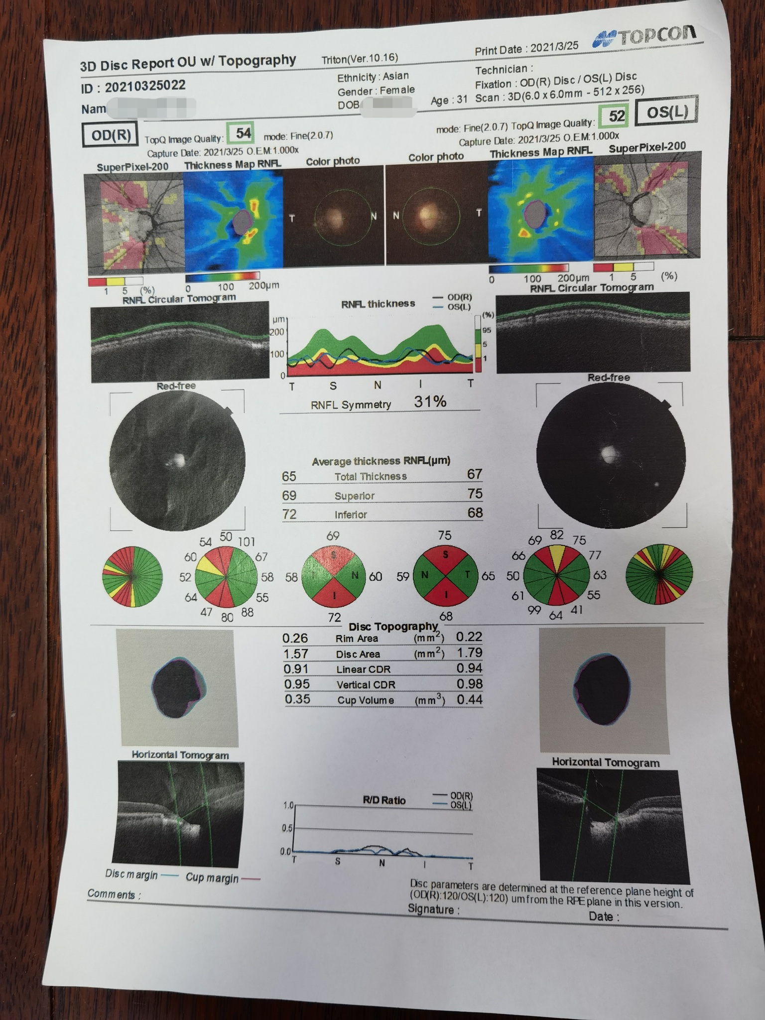 杯盤比0.9,OCT山坡圖的I側(視網膜下方)及S側(視網膜上方)都顯示有受損凹陷,如紅圈處,I側凹陷的嚴重些,反應在視野就是雙眼視野的上半部均有缺損產生,且上半部比下半部嚴重一點。