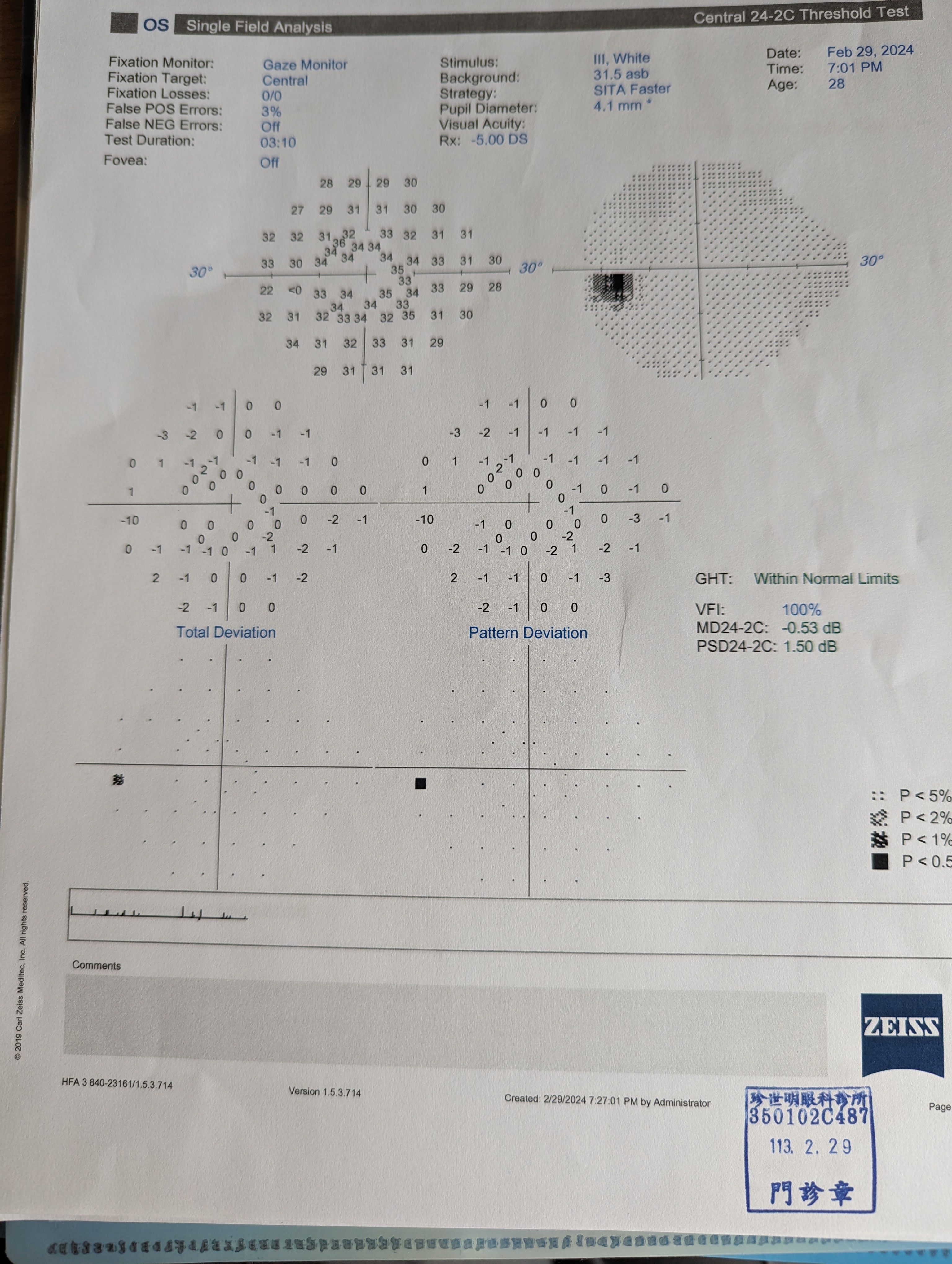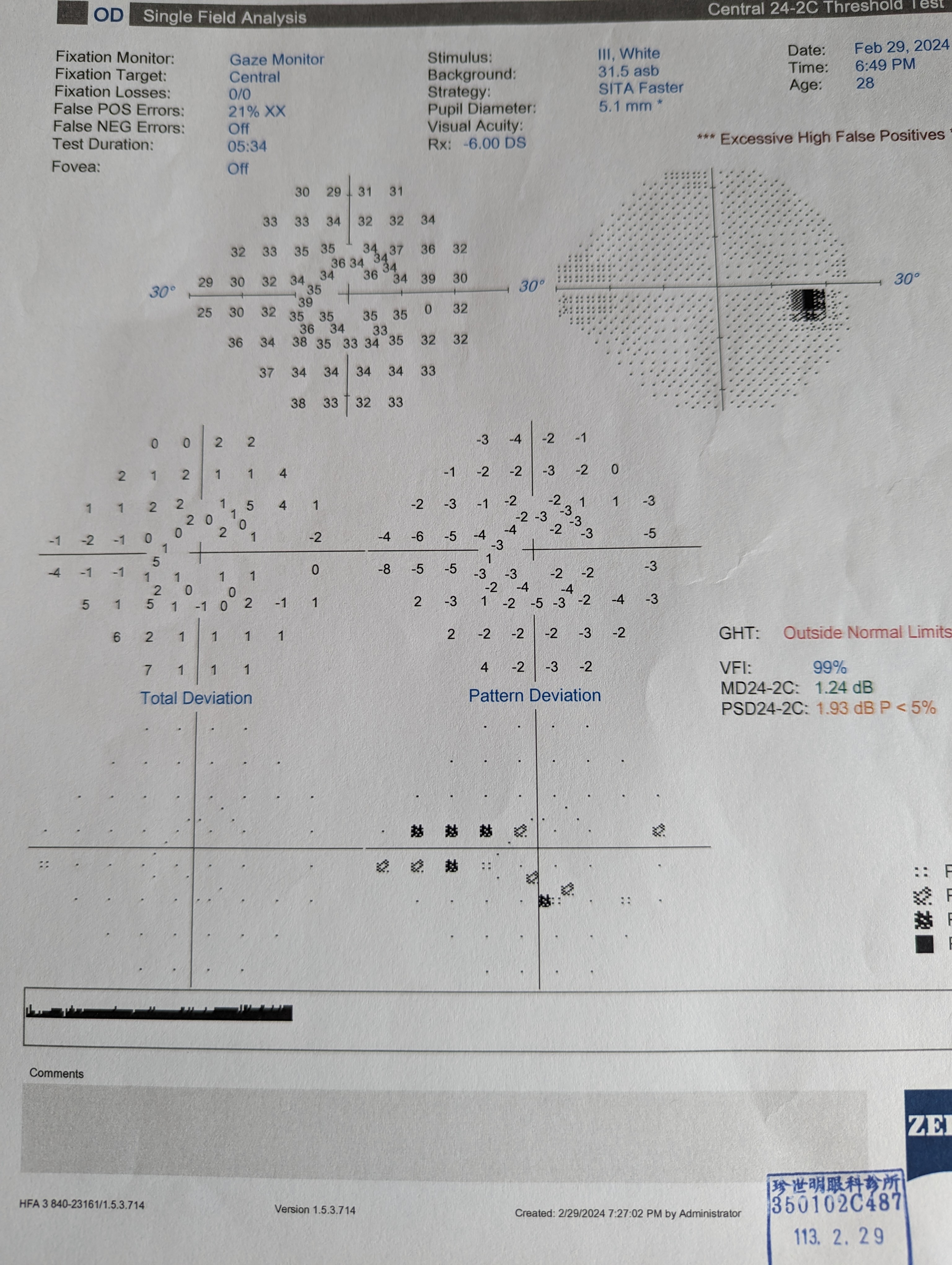 版主您好,所以目前來說我的視野報告(OD)是有參考意義的嗎,想詢問OCT OD TS~NS比較凹的部分是否有對應到視野檢查缺失的部分,另外想詢問眼壓這樣的波動是可以接受的嗎?,因為之前平常晚上在診所大概都是14~16左右,另外這次是看北市聯的顏竹佑醫師,因為看簡介也是青光眼科的,但是這次看診比較神奇的是完全沒有用裂隙燈看我的眼底,只有單純看眼壓及OCT的部分。