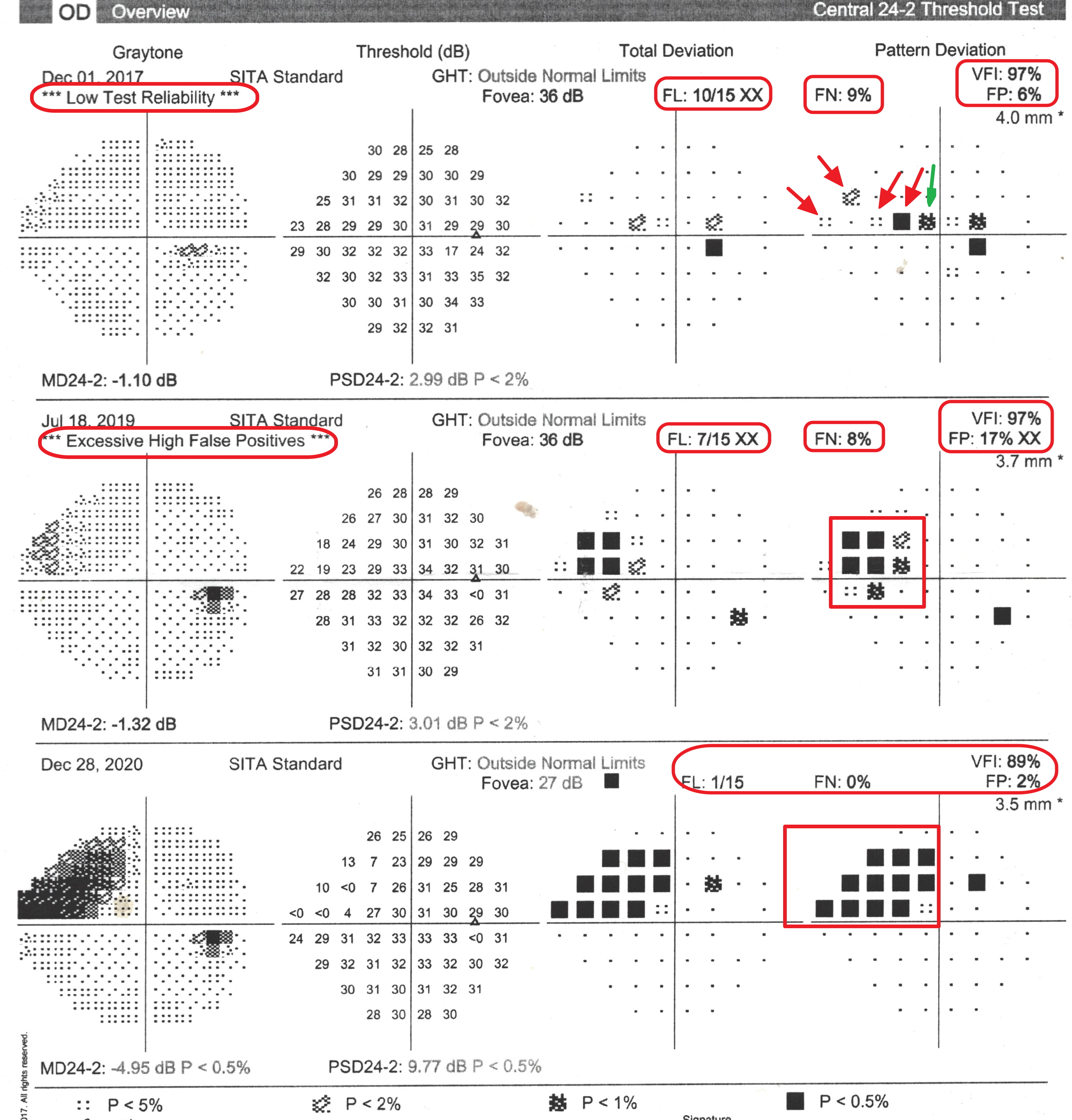2019年FL=7/15,一樣有一半的時間眼睛漂移,加上FP=17%(假陽性,就是機器有嗶聲但沒光點產生,你還是按了按鈕,表示你求好心切,即使沒看到光點還是按了按鈕),左上角也顯示"假陽性超標",這樣更會使報告偏向沒有缺損,所以VFI一樣97%,但這次黑方塊更多更明顯了,表示右眼左上方視野缺損持續進展。